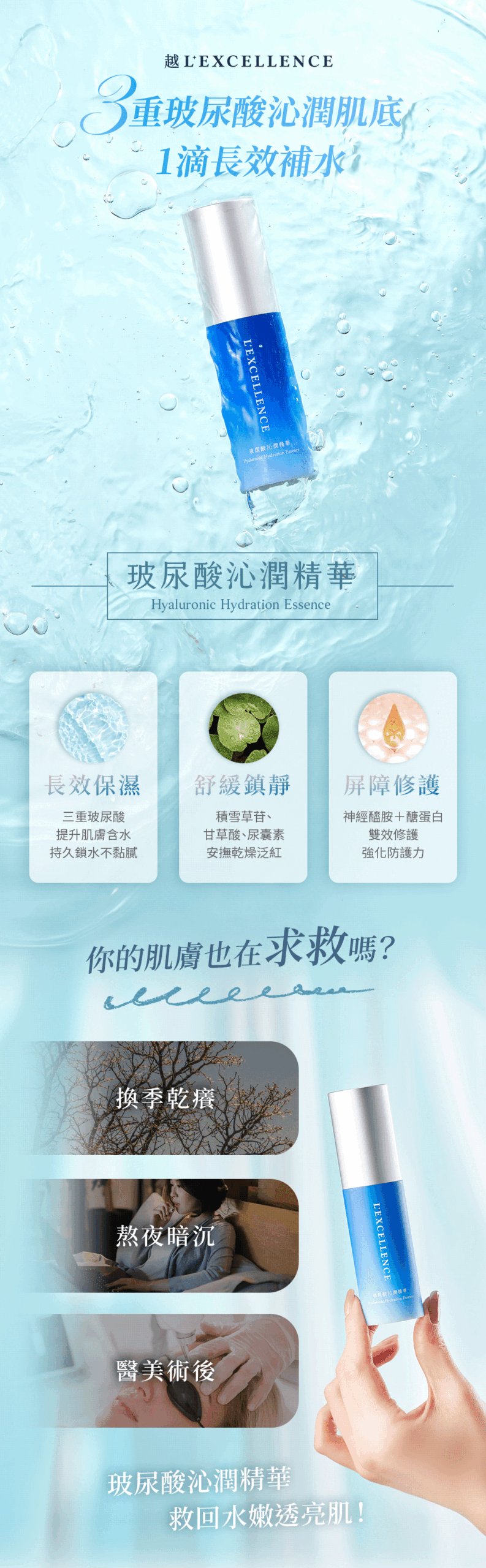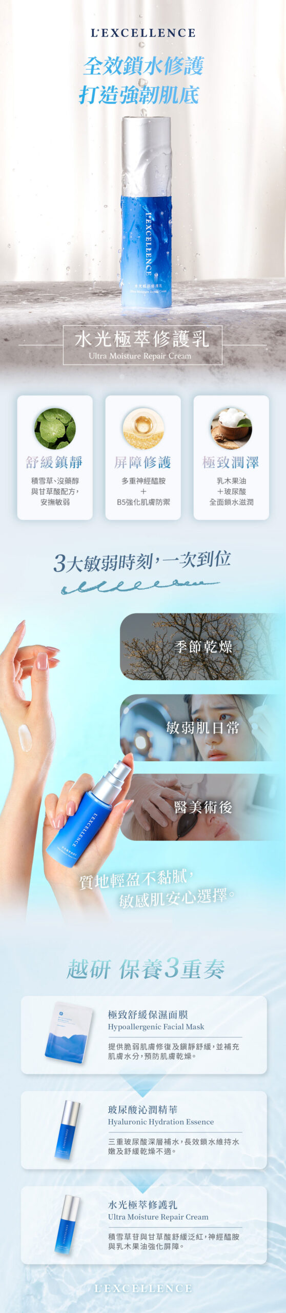 三重玻尿酸補水保濕,提升肌膚含水,長效鎖水保濕。積雪草苷與甘草酸配方,溫和舒緩因乾燥引起的不適。神經醯胺與醣蛋白修護屏障,穩定膚況。無酒精無香料更安心。