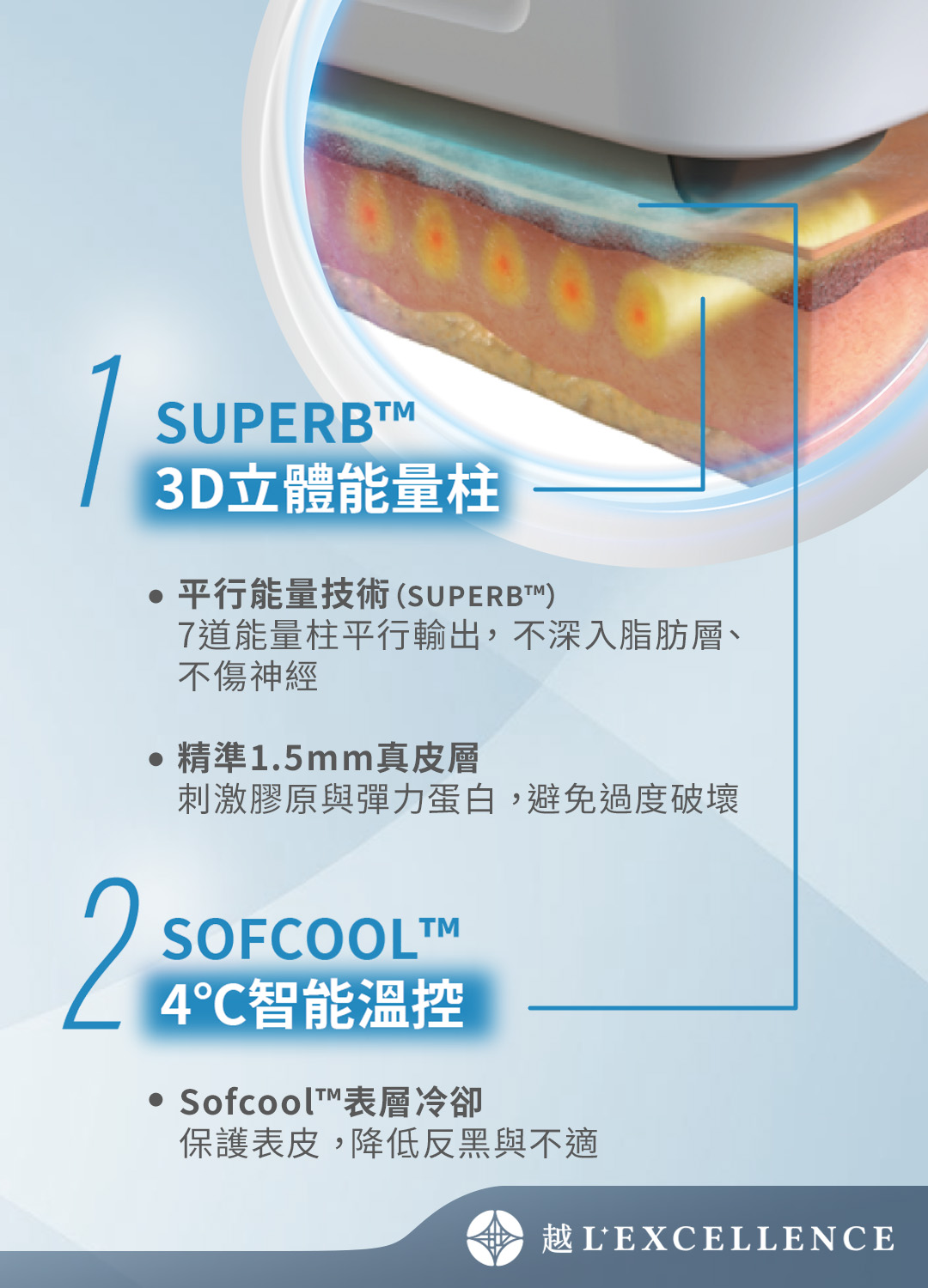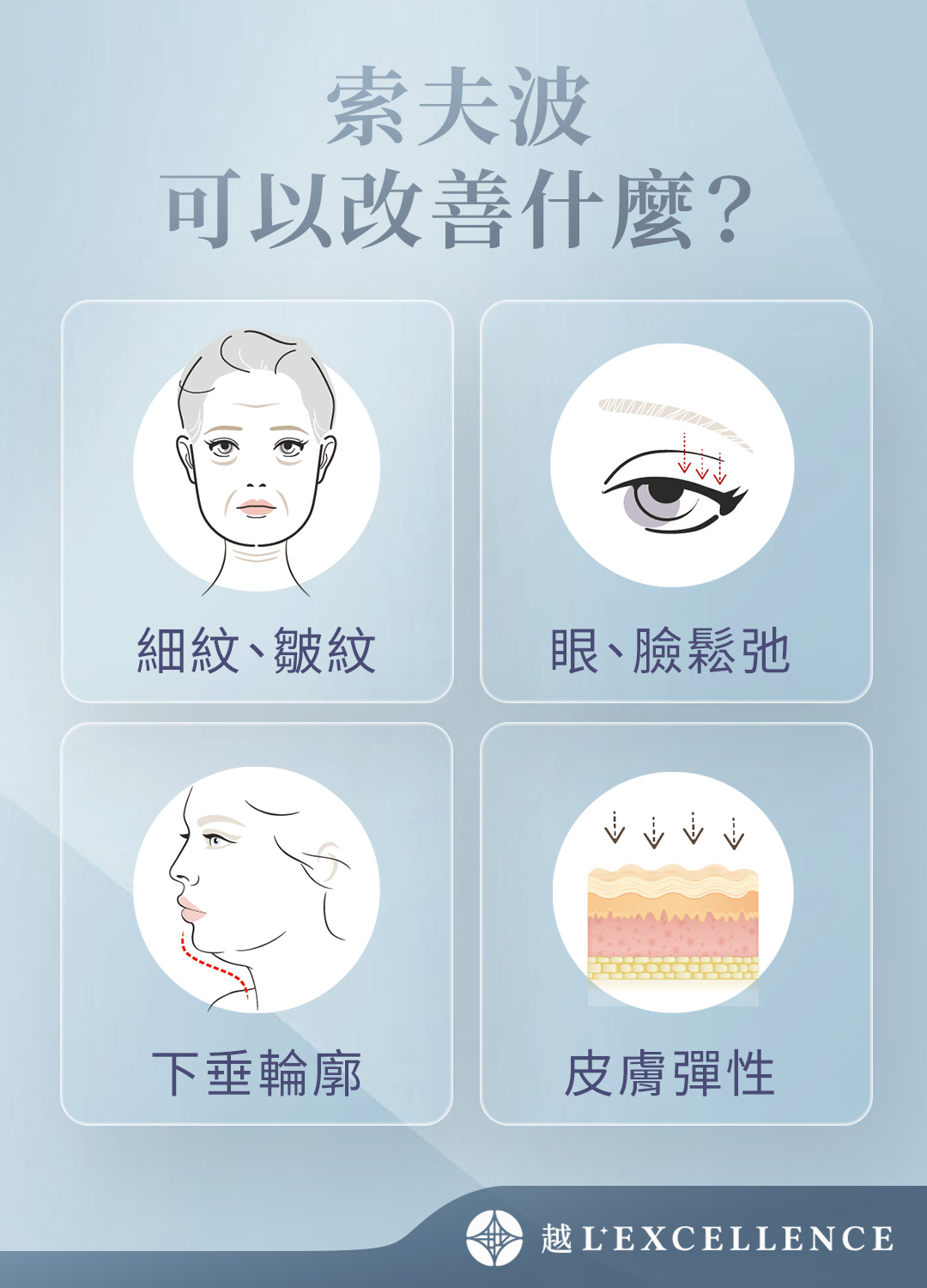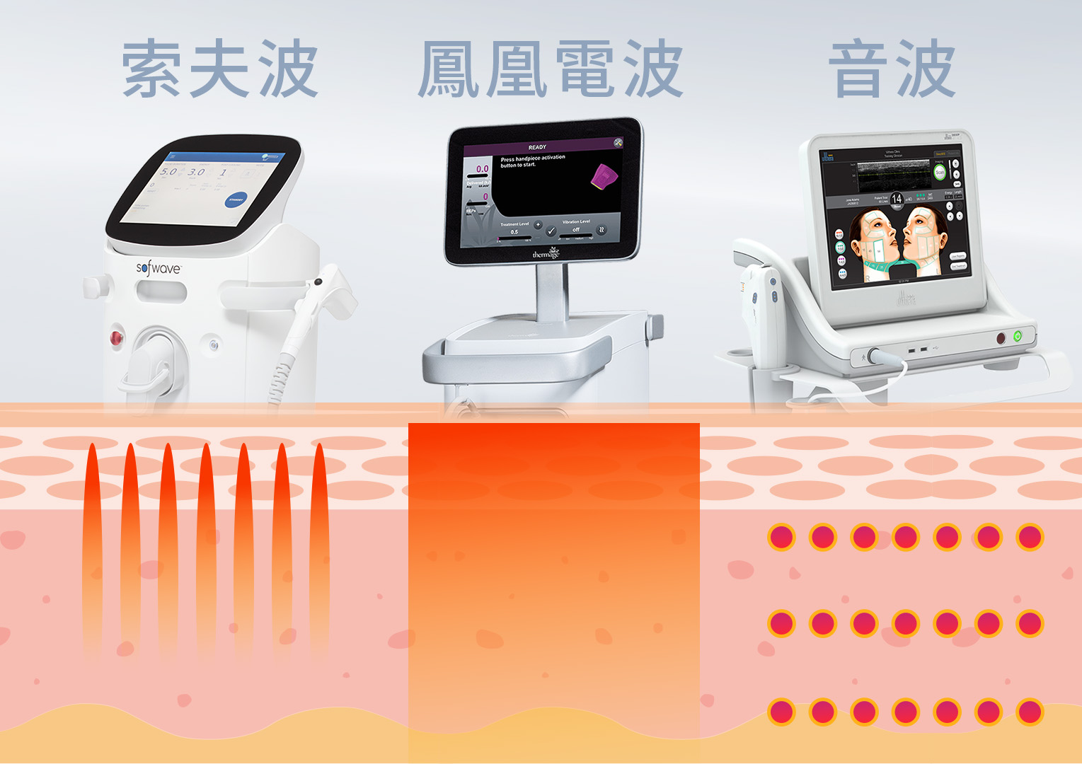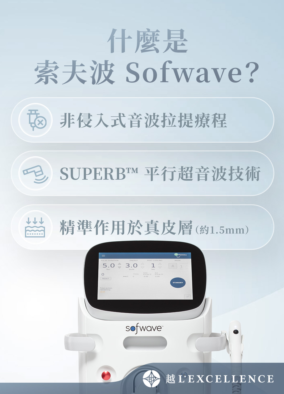 索夫波音波拉提|非侵入式輪廓重建 “從真皮層啟動膠原新生,讓輪廓自然回到年輕位置” 當臉部線條開始模糊,問題不只是表面,而是支撐結構正在悄悄流失。索夫波音波拉提,透過高能量聚焦超音波,從肌底啟動緊緻機制,讓輪廓回到該在的位置。 膠原蛋白從25歲開始流失,是老化的真正起點 法令紋逐漸加深 嘴邊肉開始下垂 下顎線不再清晰 雙下巴悄悄出現 看起來疲憊無精神 這些變化,來自支撐力的下降,而不是單純老化。 Sofwave® 索夫波由以色列 Sofwave Medical 研發,為新一代非侵入式音波拉提療程,專為改善肌膚鬆弛、細紋與膠原流失而設計。 結合專利 SUPERB™ 3D立體能量技術 與 Sofcool™ 智能冷卻系統能在短時間內將約 65°C 熱能精準作用於真皮層,啟動膠原蛋白與彈性纖維新生,同時保護表皮不受熱傷害。 索夫波治療原理 索夫波(Sofwave)透過精準音波能量,從肌底啟動緊緻機制 1|能量精準傳遞至真皮層 索夫波以多重平行能量輸出,將超聲波穿透表皮與皮下組織,直達真皮層關鍵位置。 2|形成穩定熱能作用點 能量於真皮層形成微小且均勻的加熱區域,精準作用於膠原蛋白所在層次,避免不必要的組織傷害。 3|啟動膠原蛋白新生 熱能刺激肌膚啟動自我修復機制,促進膠原蛋白與彈力纖維增生與重組。 4|自然達到緊緻拉提效果 隨著膠原結構逐漸重建,肌膚變得更緊實、有彈性,輪廓線條也隨之提升。 Sofwave® 已通過美國 FDA 認證,可有效改善: 眉眼與下顎線拉提 臉部細紋與皺紋淡化 臉部與頸部緊緻 橘皮與妊娠紋改善 全程無需手術、幾乎無恢復期,在安全與舒適中,實現自然緊緻與輪廓雕塑。 索夫波效果與臨床數據 核心效果 眉眼與下頷線拉提:提升眉眼位置與下頷輪廓,線條更立體自然。 淡化皺紋與細紋:改善眼周、額頭及頸部紋路,肌膚回復平滑。 改善肌膚鬆弛:緊緻臉部、下顎與頸部,重塑年輕輪廓,減少雙下巴。 提升膚質與光澤:促進膠原蛋白與彈性蛋白新生,改善粗糙與暗沉,使膚色均勻細緻。 長效緊緻支撐:SUPERB™專利技術將熱能精準作用於真皮層,持續強化肌膚彈性與緊緻度。 臨床數據 **72.4%**患者於治療12週後明顯改善 **86.2%**患者 FWS 皺紋指數改善 1–3 分 單次治療後膠原蛋白增加 68.7%,彈性蛋白增加 33.5% 月恆探頭|全臉打底拉提 大範圍 × 高效率 × 穩定輸出針對全臉與頸部進行大面積能量覆蓋,作為整體輪廓的基礎拉提,均勻啟動膠原新生,重建支撐結構。 星輝探頭|精準細節補強 小面積 × 高貼合 × 精準雕塑專為細緻區域與臉部曲線設計,精準作用於較難覆蓋的部位,加強局部緊緻與細紋改善。 Sofwave索夫波和電音波的差異 醫美療程比較表 Sofwave 索夫波 (SUPERB™) Thermage FLX 鳳凰電波 音波 能量分布 3D 能量柱 (容積式) 廣域容積加熱 點狀聚焦 (HIFU) 加熱深度 1.5mm - 4.5mm(容積式加熱) 0mm - 4.3mm(全層加熱) 1.5 / 3.0 / 4.5 / 6 mm(點狀加熱) 加熱溫度 60°C - 70°C (65) 45°C - 55°C 65°C - 70°C 核心優勢 緊緻拉提一次到位、不凹臉、高安全性 改善膚質細紋、全層皮膚緊緻 深層拉提、重塑筋膜層(SMAS) 舒適程度 高 (4°C 智能冷卻技術) 中 (震動減痛技術) 較低 (熱凝結點痛最明顯) 索夫波常見問題 FAQ 索夫波是什麼? 索夫波(Sofwave)是一種非侵入式音波拉提療程,透過高能量聚焦超音波精準作用於真皮層,刺激膠原蛋白與彈性纖維新生,從肌底改善鬆弛、細紋與輪廓線條。 索夫波效果多久出現? 療程後部分緊緻感可立即感受,隨著膠原蛋白持續新生,約在 1~3 個月效果逐漸明顯,整體輪廓與膚質會持續改善。 索夫波可以維持多久? 一般可維持約 6~12 個月,實際效果會依個人膚質、年齡與生活習慣而有所不同。透過定期保養,可延續緊緻效果。 索夫波需要做幾次? 多數情況下 單次療程即可見改善效果,建議每年進行 1~2 次作為維持與加強,實際次數仍需由醫師評估後決定。 索夫波有恢復期嗎? 索夫波屬於非侵入式療程,幾乎沒有恢復期,療程後可立即上妝並恢復日常生活。少數人可能出現短暫泛紅,通常很快消退。 索夫波會痛嗎? 療程過程中會感受到溫熱與些微痠感,多數人皆在可接受範圍內。實際感受會依個人耐受度與施作部位有所不同。 索夫波有副作用嗎? 索夫波為非侵入式療程,副作用風險較低。少數人可能出現短暫泛紅或輕微腫脹,通常於數小時內自然消退。 索夫波適合什麼年齡? 一般建議 25歲以上即可開始進行預防性保養,30歲以上若出現鬆弛與細紋,效果會更明顯。 誰適合做索夫波? 肌膚輕至中度鬆弛者:臉部、下頷線或頸部輕微下垂,輪廓不清晰。 有皺紋與細紋者:眼周、額頭及頸部細紋明顯,想改善老化痕跡。 想預防老化者:25 歲後膠原蛋白流失,適合提早保養,維持緊緻彈性。 想改善膚質者:肌膚粗糙、暗沉或毛孔粗大,渴望光澤與細緻感。 不想動刀的人:拒絕侵入式手術,偏好安全、無恢復期療程。 生活忙碌、無法長時間休養者:治療後可立即恢復日常活動。 索夫波效果好嗎?值得做嗎? 索夫波適合輕中度鬆弛族群,效果自然、不僵硬,特別適合不希望動刀但想改善輪廓的人。 索夫波可以和其他療程一起做嗎? 可以,常見搭配如電波拉提或填充療程,可同時改善鬆弛與凹陷問題,達到更完整的年輕化效果。 索夫波安全嗎? 索夫波已通過美國 FDA 認證,並搭載表層冷卻技術,在有效傳遞能量的同時保護肌膚,整體療程安全性高、風險低。 索夫波術後需要注意什麼? 